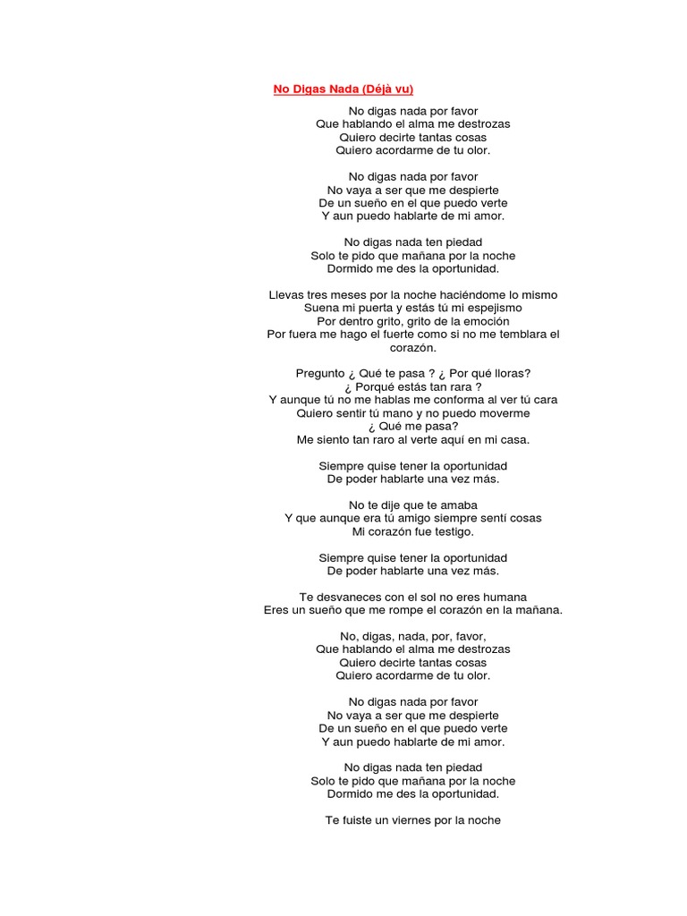 No Digas Nada Letra - No digas nada por favor que hablando el alma me destrozas quiero decirte tantas cosas quiero acordarme de tu olor. No Digas Nada Letra - Encuentre mas letras y videos de natalia en album cancion y letra.